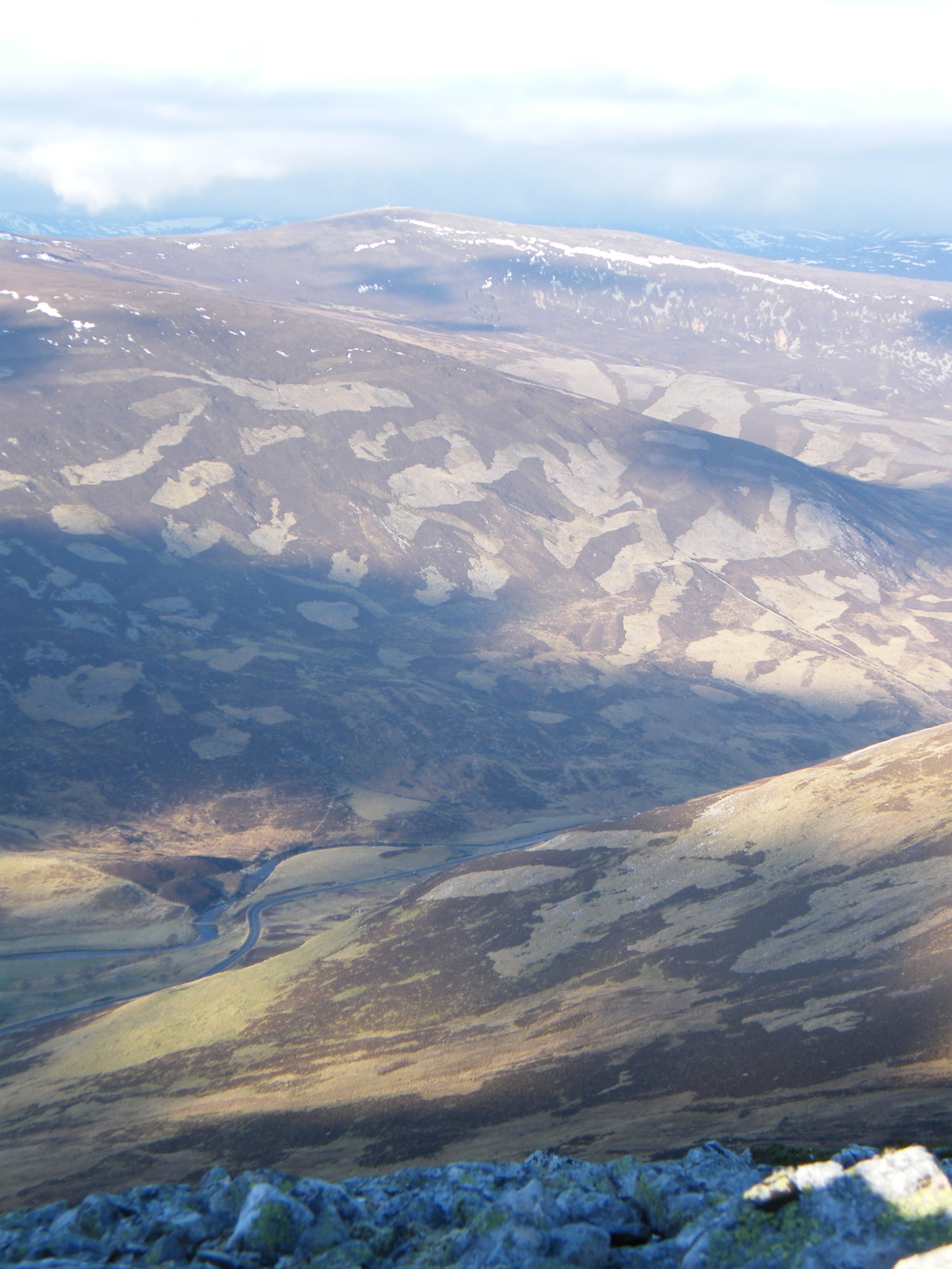 The photo shows how little snow remains in the Glen Shee area, with mere patches on the high Cairngorms in the distance. We were in the sun for most of our short jaunt on Creag nan Gabhar, but to the north and east, a blanket of cloud lay over the higher peaks. However, despite the lack of snow, the wind chill at the summit soon reminded us that it was actually December and all extra layers had to be donned in order to sit, admire the views and enjoy lunch.