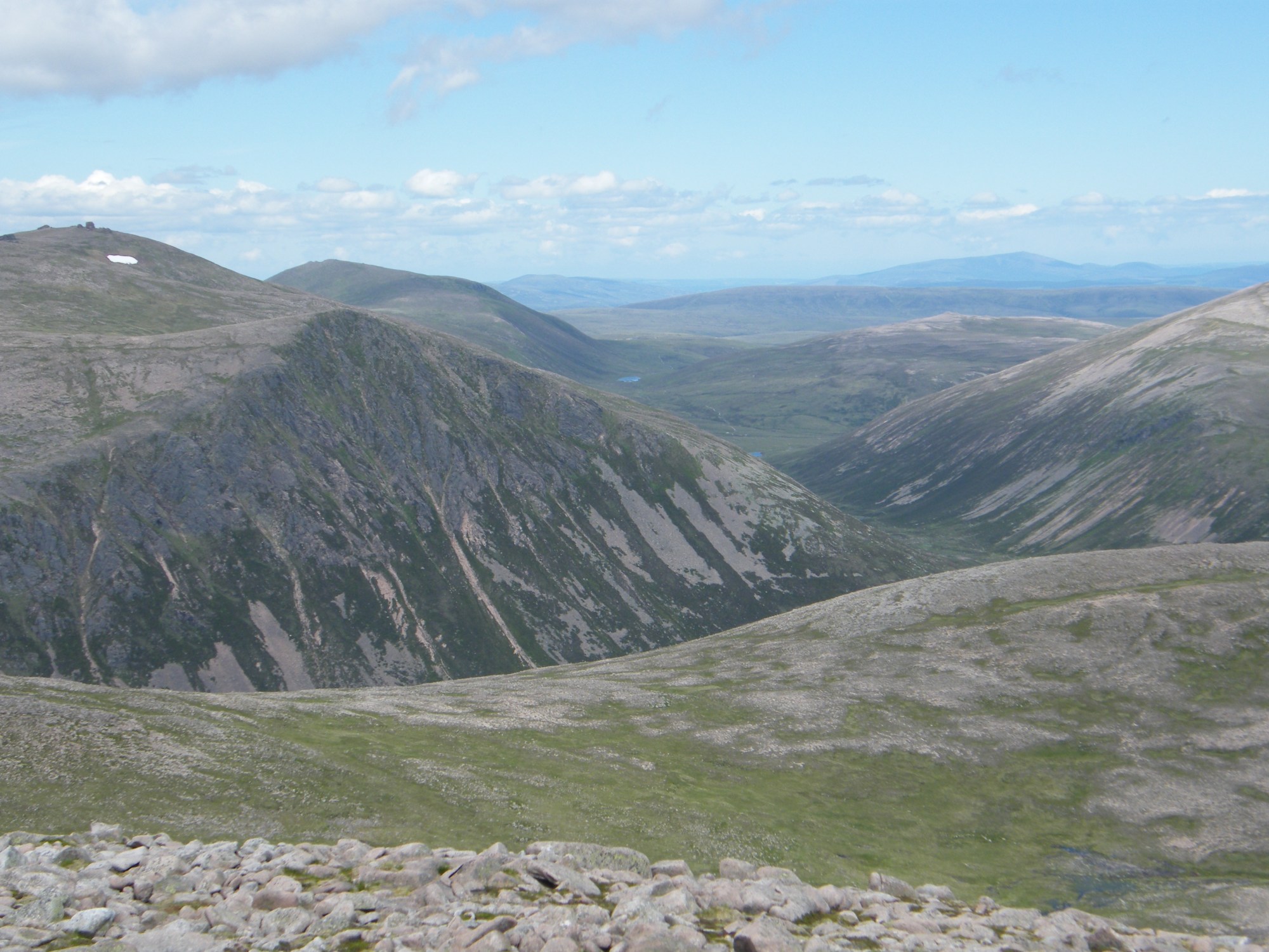 The day began with beautiful summer weather – and that strange feeling when you leave your vehicle and know that you will not be returning to it. Plenty of sunshine, warm with stunning blue skies. In fact, it was just a bit too warm as we embarked on the climb up Derry Cairngorm (having spent the walk-in to Derry Lodge debating whether to go via Glen Derry or to get ourselves up high for views as soon as possible). So we toiled up the path in the rapidly escalating heat, making sure that we were not overcooking the pace.
