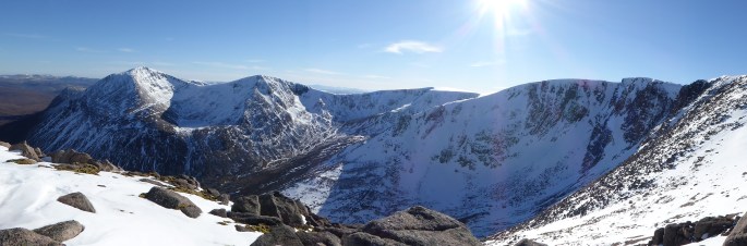 Even with snowshoes on, the ascent of Culardoch was hard work. Sitting on top of Carn Liath watching the sunset just in a light softshell, noting that there was absolutely no breeze or sound, I could see through to Cairn of Claise and was reminded of how perishingly-cold it had been there just a few weeks previously.