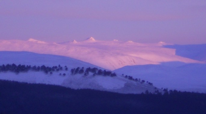 This year has been a good example of what I mean. OK, I will admit that the January 1st ascent of Mount Keen is perhaps not one I will remember as having been more than a pleasant day out. But from then onwards it has been an excellent year full of new experiences, in spite of it involving the same hills I always do at this sort of time of year – and all of them in pretty good weather. A snowshoe-supported round of the Loch Callater hills was noteworthy for the lack of seeing anyone “on foot” – not even any footprints. The only other person able to get up there was on skis. As part of the quest for new experiences I thought I would settle down at the summit of Cairn of Claise and wait for the sunset to develop….wearing two pairs of gloves and a pair of mittens, a headband, a hat, a thick winter jacket, a thick primaloft jacket and a thin down jacket….all with the hoods up. The sunset was indeed stunning, but I had to head off before it reached its zenith as I was shivering so badly I could no longer operate the camera.