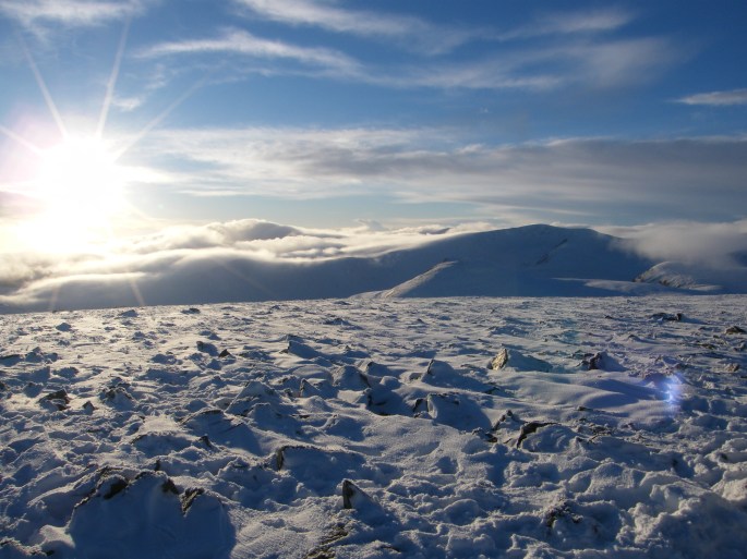 A retrace over Carn an-t Sagairt Beag to its neighbouring higher summit of Carn an-t Sagairt Mòr (1047m) meant that we were now facing into the wind. I donned my goggles only to discover kit failure no. 3. My googles (again newish – and, it must be said, not cheap) demonstrated an annoying tendency to completely steam up on one side. The left side of my world was fogged over, but with the wind in my face, I needed the goggles on. We continued. The sun started to sink behind the distant hills. The approach from the north east to Carn an-t Sagairt Mòr is steepish and about half way up we hit a patch of hard névé, pretty much a layer of ice. Iain, in his double plastic boots (why on earth was he wearing those – they looked ridiculous!?), skimmed up the slope effortlessly. My old Mantas with starting-to-wear profiles got me about 5 steps up. Using the boot edge as a tool was proving completely ineffective, so grumbling, I retreated and re-tried, this time deploying the ice axe for step cutting. The icy névé was pretty solid and I could see me being there until midnight as I tried to carve out something resembling a stairway for myself. Cursing even more, I retreated again and whipped out my crampons (all good fun when working with liner gloves that provided no protection from the elements). Kit failure no. 4. I had checked at the beginning of the season that my crampons were correctly adjusted for my boots, but I had forgotten that there had always been a very slight mismatch between the right boot and its crampon. And now, the lever at the back of the crampon was rather loose on the boot. Eventually, I managed to adjust the system to the point where I felt happy that the combination of the straps and mechanism wasn’t going to cause any problem. And, finally, up I went.