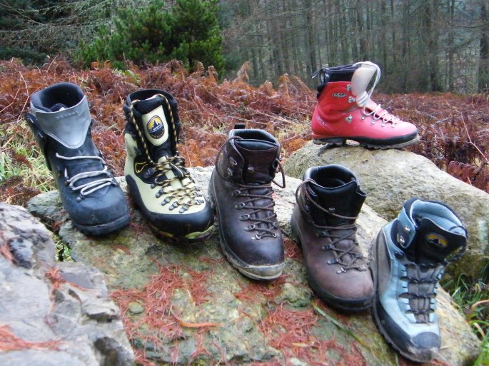 There’s a slightly surreal feeling as you find yourself surveying a winter boot collection accumulated over a number of years. At one end of the range (left) I have the boots that I loathe – the Scarpa Vega may, on other people’s feet, have scaled every 8000m peak in the world, but that doesn’t mean that anyone ever took any pleasure from walking in them. They are like blocks of wood, only less sensitive. I remember grimly struggling with these boots on the approach to the glacier on Cayambe in Ecuador. I also remember being laughed at in the Alps as being the only person in the entirety of France, Switzerland, Austria and Italy combined to be wearing double plastic boots. Oh yes, each and every last person in the Alps that summer was wearing the trendy La Sportiva Nepal Evo (second boot from left): solid, dependable, with thick leather to keep you warm and, like the Vega, graded at B3. These are the boots that I am presently taking on short jaunts to find out just how much damage they might do to my feet on an epic day. I’ve actually been pleasantly surprised: I’ve been expecting a similar agonising experience to the Vegas, which they haven’t yet delivered (yay!)… but they are decidedly weighty. They seem a bit of overkill for a Scottish winter (unless climbing higher grades) when compared to the gold standard Scarpa Manta (old model, centre, graded B2). Whether intentionally or not, this boot seems to have been designed with the Scottish winter in mind, able to cope with approaches through the bog, wet snow, scrambling over slippery lichen-covered rocks and the ubiquitous heather bashing as well as the more typical demands made of a winter boot. But perhaps the ultimate ‘all-rounder’ boot for Scotland, versatile enough to be used in summer conditions, but also a stalwart doyen for most winter conditions is the Scarpa SL (second from right). This is my year round go-to boot. My many pairs have seem umpteen Munro expeditions (summer and winter), have taken me up Shasta and Rainier in the Cascades and peak bagging in the US Rockies and trekking around all manner of terrains in New Zealand. In my opinion this boot is top of the B1 grade. I’ve spent entire days with crampons attached to this boot and they cope admirably. It is one of the few all-leather boots remaining on the market, and I’m hoping that Scarpa don’t make too many changes to this iconic model. At the lower end of the B1 grade is the La Sportiva Trango (right). It’s amazingly light and comfortable, but I’m not convinced that it will stand up to many months of traversing sharp scree or scraggly heather. And that’s why I avoid taking them over too much of this. Obviously it’s a matter of opinion but personally I don’t find that these offer sufficient ankle support to permit more than occasional use of crampons.