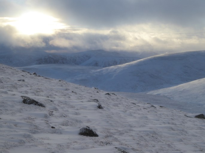 The photo shows how little snow remains in the Glen Shee area, with mere patches on the high Cairngorms in the distance. We were in the sun for most of our short jaunt on Creag nan Gabhar, but to the north and east, a blanket of cloud lay over the higher peaks. However, despite the lack of snow, the wind chill at the summit soon reminded us that it was actually December and all extra layers had to be donned in order to sit, admire the views and enjoy lunch.