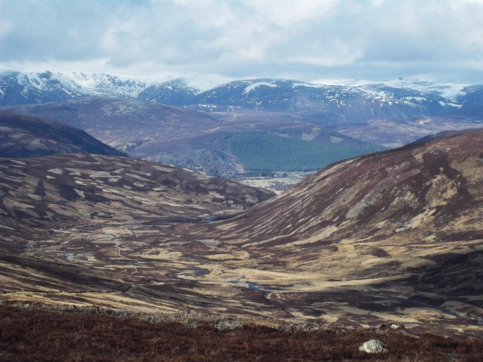 After attending a fairly demanding winter mountaineering course last weekend, and then following this up with four days of intensive horse riding, a straightforward hill day was definitely in order. So we decided on a shortish jaunt – up Glen Callater then onward to Carn an Tuirc and Cairn of Claise. Winter is definitely in retreat – there was very little snow underfoot. The main photo shows some lying on the high Eastern Cairngorm plateaus, while the odd cornice was still clinging to various precipitous edges. Of course, it’s still only March and winter could yet return with a vengeance…. watch this space…..